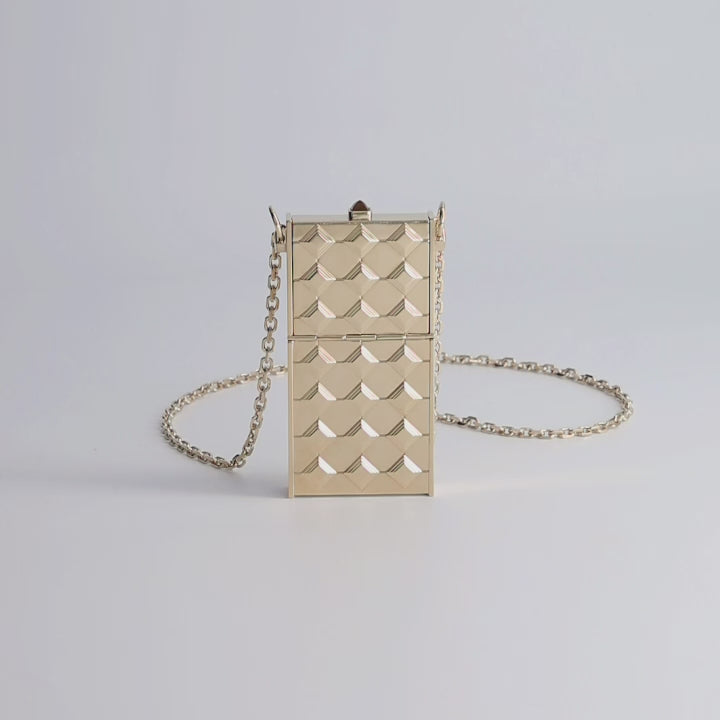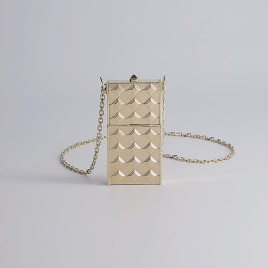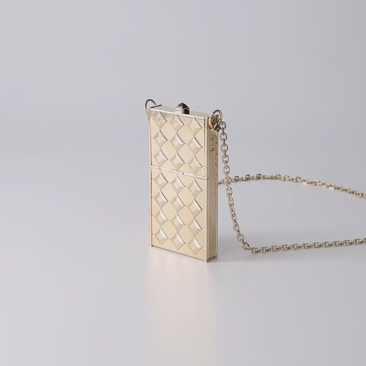 Boîtier avec chaîne, finition en or véritable ou en palladium silver, doté d’une ouverture frontale manuelle, pouvant contenir jusqu’à 9 cigarettes fines ou 6 cigarettes classiques. Livré avec une cale d’adaptation en acétate.